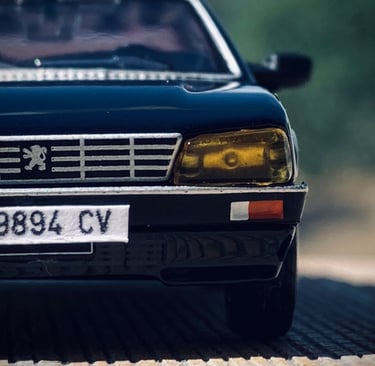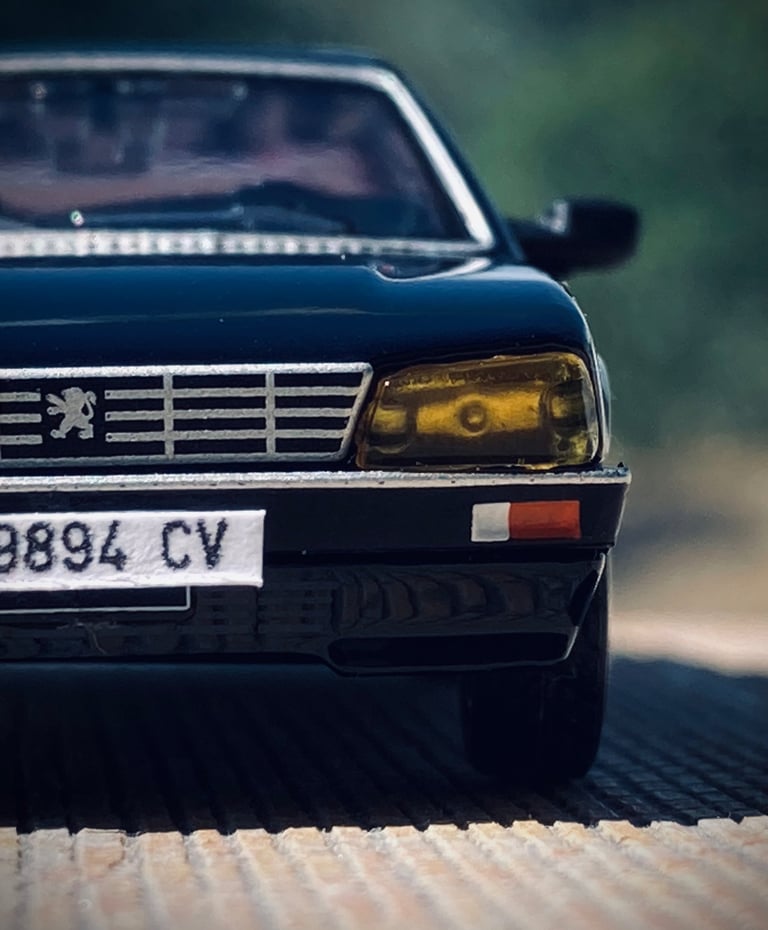 Si profundizamos en nuestro análisis, nos toparemos con un frontal espectacular que nos transmite toda la fuerza y agresividad que tenía el 505 a tamaño real. Las ópticas de plástico translucido amarillo, propias de los vehículos franceses del siglo pasado, y una rejilla fielmente replicada dónde el león de Peugeot corona la filigrana, son sencillamente maravillosas. Los intermitentes y las luces de posición, esta vez pintados, completan el plantel.